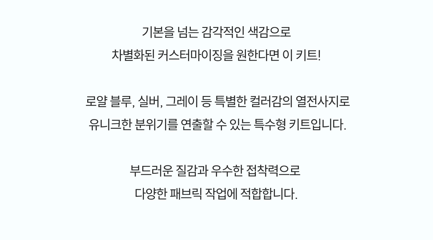 로얄 블루, 실버, 그레이 등 특별한 컬러감의 열전사지로 유니크한 분위기를 연출할 수 있는 특수형 키트입니다.